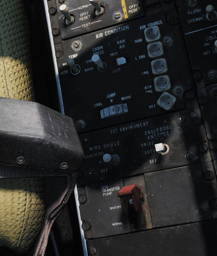 21. IR/TV (TCS 전원) 스위치를 STBY로 설정, 2분의 예열 시간을 갖는다. 그 후, 항공기가 공중에 뜰 때 ON으로 설정한다.
