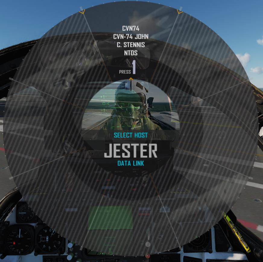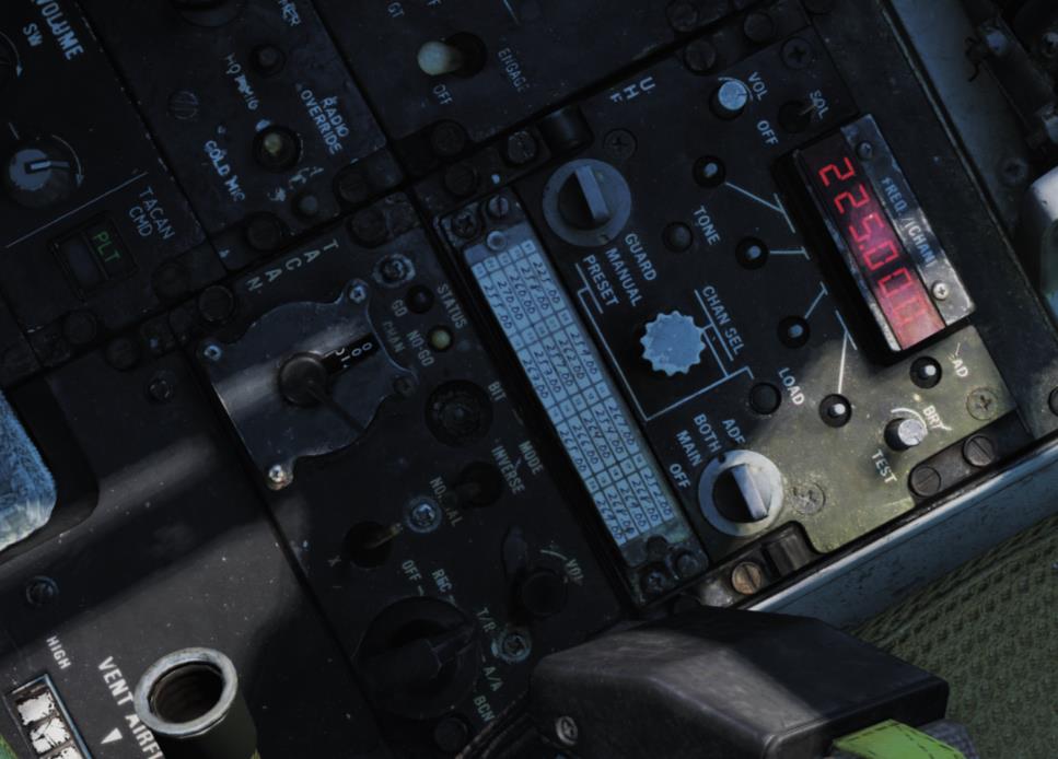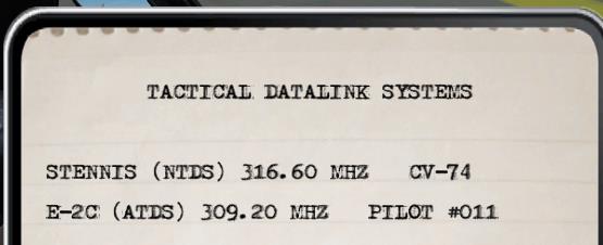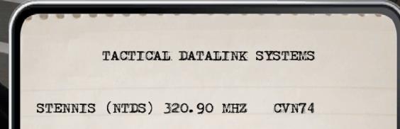 9. 데이터 링크 주파수를 원하는 네트워크로 (사진의 경우 CVN74 John C. Stennis 존 C. 스테니스 항공모함) 설정한다. 니보드 TACTICAL DATALINK SYSTEMS에 우리가 희망하는 주파수가 320.90 MHz 로 기록되어있다. 데이터 링크 선택 바퀴를 보이는 바와 같이 20.9 로 돌린다. (3 은 사전 설정이고 수정할 수 없다.)
