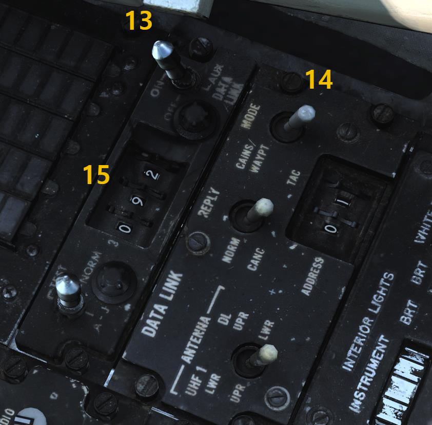 11. 데이터 링크 모드 스위치를 CAINS/WAYPT (전방)으로 설정한다. 이는 항공기와 항공모함 항공기 관성 항법 시스템 (CAINS)이 서로 통신할 수 있게 한다.