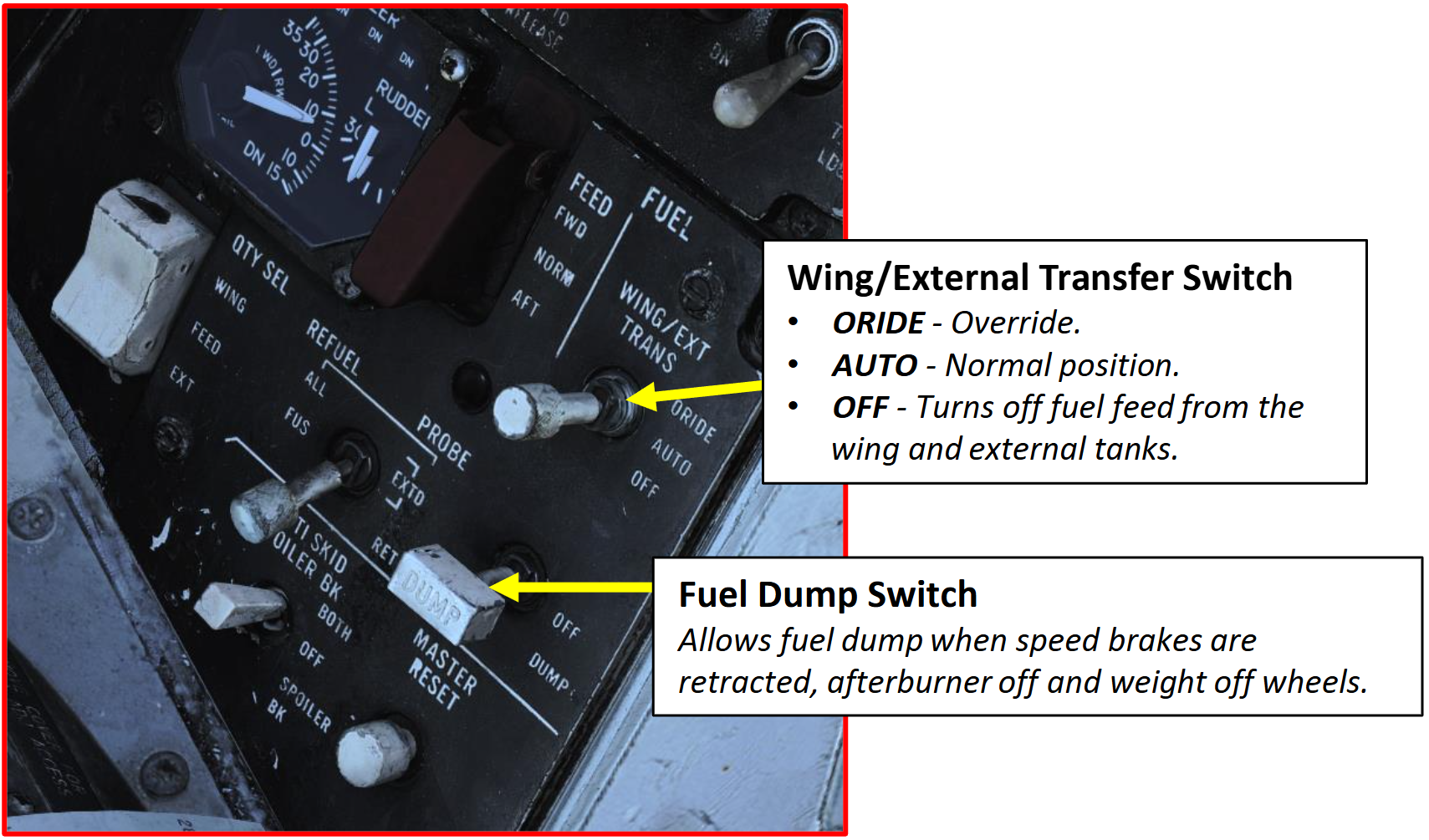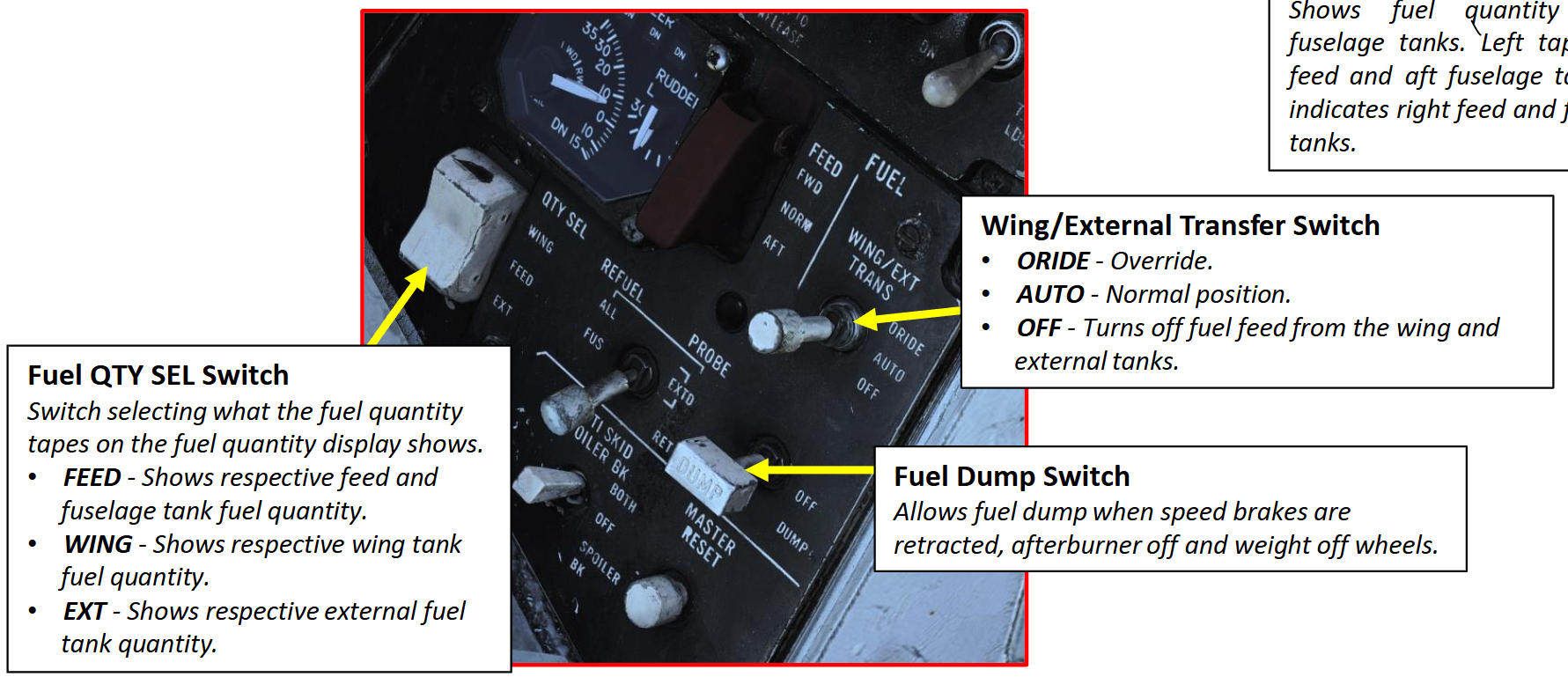 DUMP 스위치는 비버 테일의 연료 폐기 대를 통해 연료를 버리도록 만든다. 또한 이것은 동체뿐 아니라 날개와 외부 연료통에서도 연료를 버릴 수 있도록 모든 연료 이송 시스템을 활성화한다. 만약 바퀴에 무게가 실리거나 스피드 브레이크가 완전히 접혀지지 않았다면 연료 버리기는 제한될 수 있다.