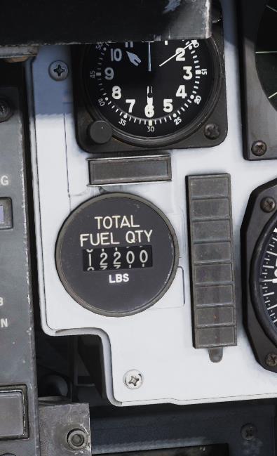 조종사 오른쪽 무릎 계기반의 연료량계는 갖고 있는 내부 및 외부 연료를 표시해준다.