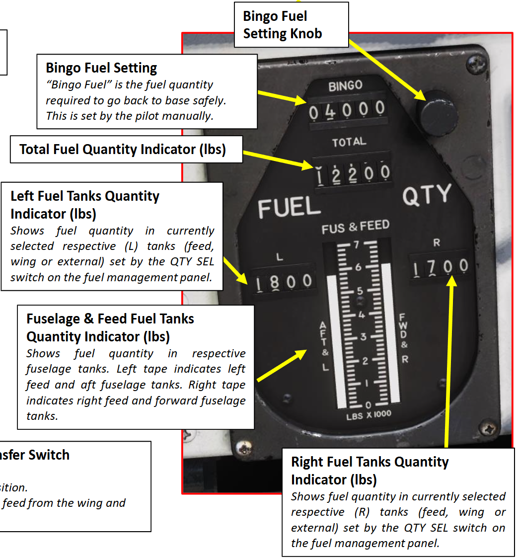● L 및 R 지시계는 보통 왼쪽 및 오른쪽 연료 공급이 각각 가지고 있는 잔량을 보여준다. 연료 관리반에 있는 Rocker Switch로 날개 내부 연료통 (WING), 외부 연료통 (EXT)을 선택하여 지시계에 보여줄 연료량을 선택할 수 있다. 이 스위치는 공급 연료통 (FEED)에 자동으로 돌아가도록 용수철 압력이 작용한다. 날개 내부 연료통 혹은 외부 연료통을 보여줄 때, 왼쪽 날개 혹은 왼쪽 외부 연료통은 L 잔량계에, 오른쪽 날개 연료통 혹은 외부 연료통은 R 잔량계에 나타난다.