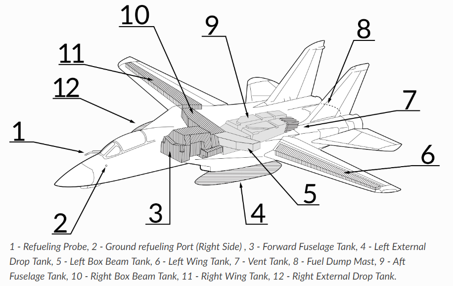 F-14가 가진 주요 연료 저장고는 각 엔진에 하나씩, 두 개의 공급 시스템으로 구성되어 있다. 오른쪽 연료 공급 시스템은 오른쪽 날개와 오른쪽 상자형 구획, 전방 동체 구획으로 이뤄져있다. 왼쪽 엔진 연료 공급 시스템은 왼쪽 날개와 왼쪽 상자형 구획, 그리고 후방 동체 구획으로 이뤄져있다. 연료량계를 읽을 때 이 사실을 염두에 둬야 한다.