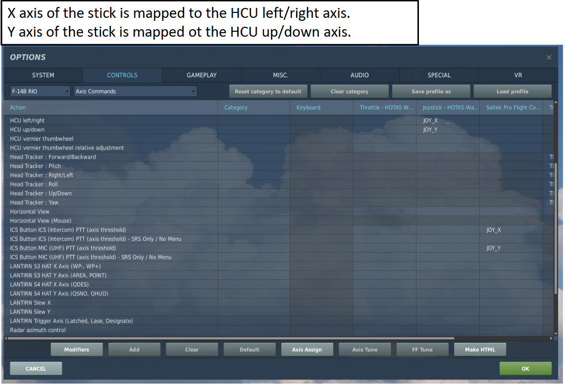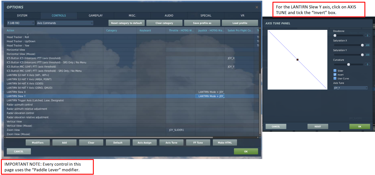 LANTIRN Slew Y 축 용으로, AXIS TUNE (축 설정)을 누르고 "Invert" 상자에 표시한다.