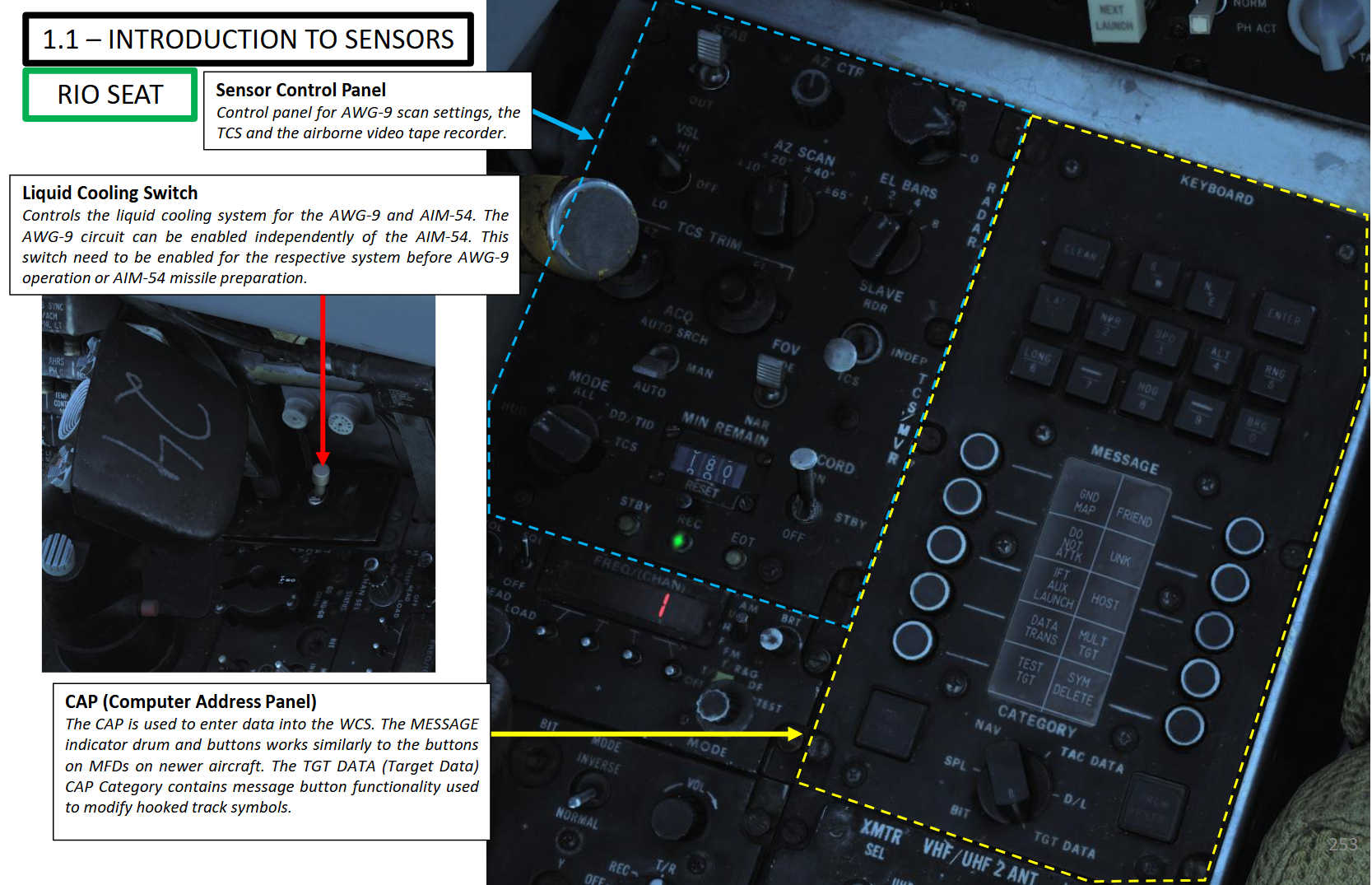 CAP는 WCS에 정보를 입력하기 위해 사용된다. MESSAGE 원통형 표시계와 단추들은 최신 항공기들의 MFD의 단추들과 비슷하게 작동한다. TGT DATA (표적 정보) CAP 범주(Category)는 추적 중인 항적 기호를 수정하기 위해 사용되는 기능성 메시지 단추를 갖고 있다.